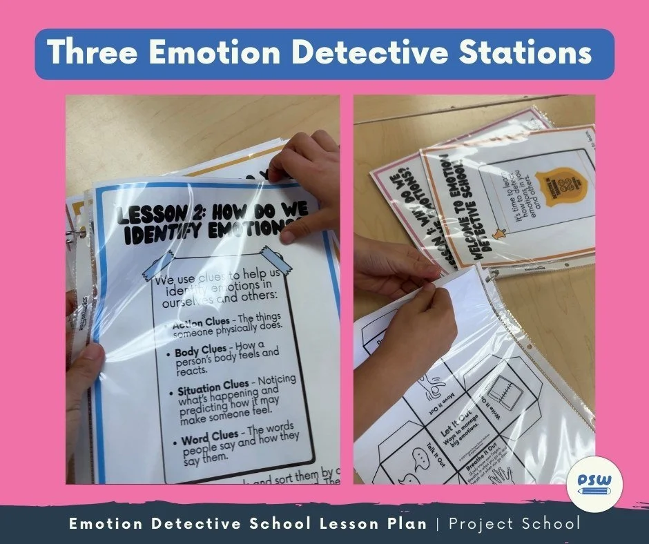 Here’s how you set up the Emotion Detective School activity. For this elementary health learning experience, instead of setting up three different physical stations, I made an Emotion Detective School packet for each group (one set for every 3-4 students). Then, students worked through the “lessons” with their partners at their own pace.